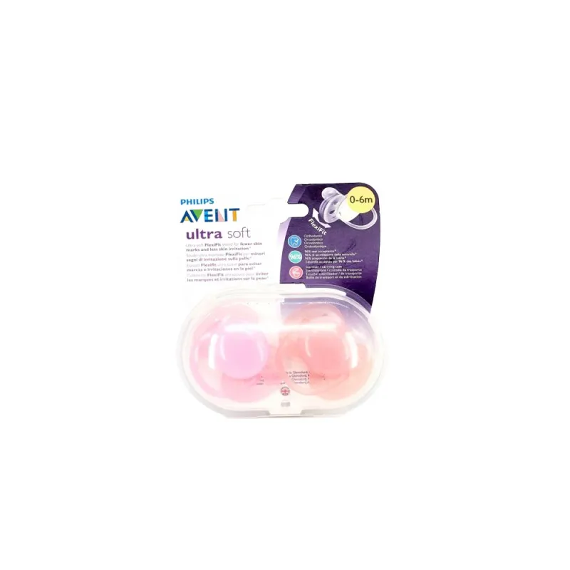 Este pack incluye dos unidades de chupetes Avent Ultra Soft en tonos rosa y melocotón, perfectos para su niña.