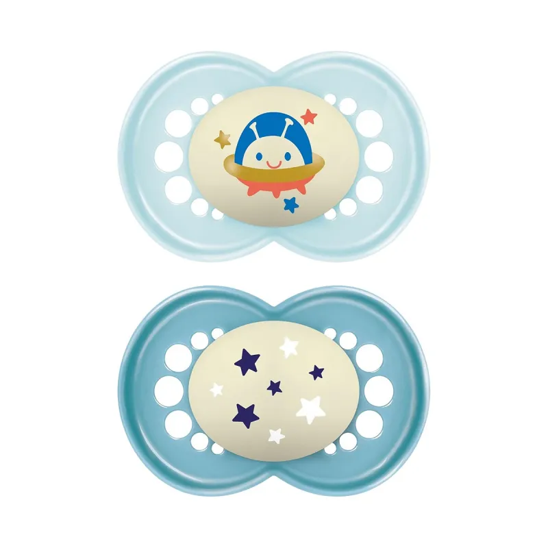 MAM Chupete Silicona Fisiologico Original Night Azul +16M es un chupete que brilla en la oscuridad, diseñado para bebés mayores de 16 meses, desarrollado con especialistas y hecho con silicona suave MAM SkinSoft™.
