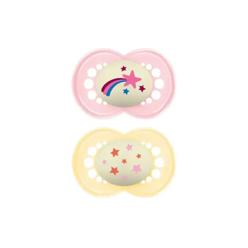 MAM Chupete Silicona Fisiologico Original Night Rosa +16M son chupetes diseñados para bebés mayores de 16 meses, que no solo cumplen con la función de satisfacer el reflejo de succión, sino que también cuentan con la particularidad de brillar en la oscuridad, facilitando su localización durante la noche.