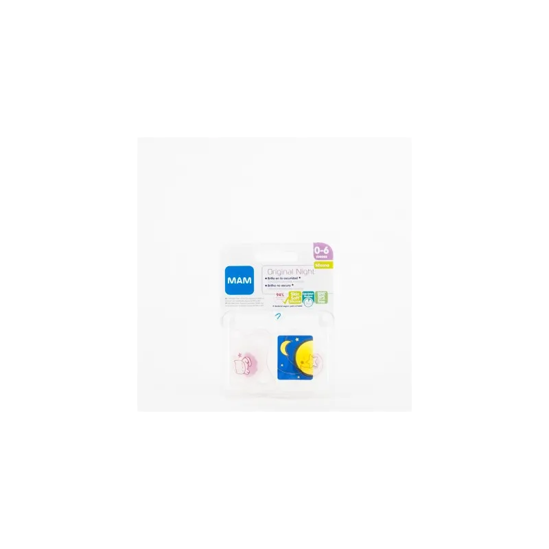 2 Chupetes MAM Original Night, con tetina de silicona suave, brillan en la oscuridad. Diseño en tonos rosas y blancos. Para bebés de 0 a 6 meses.