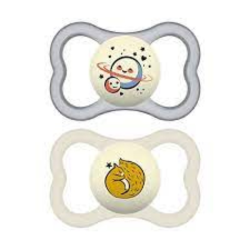 La presentación de MAM Chupete Silicona Simetrica Supreme Night Neutro +6M contiene 2 unidades de chupetes.