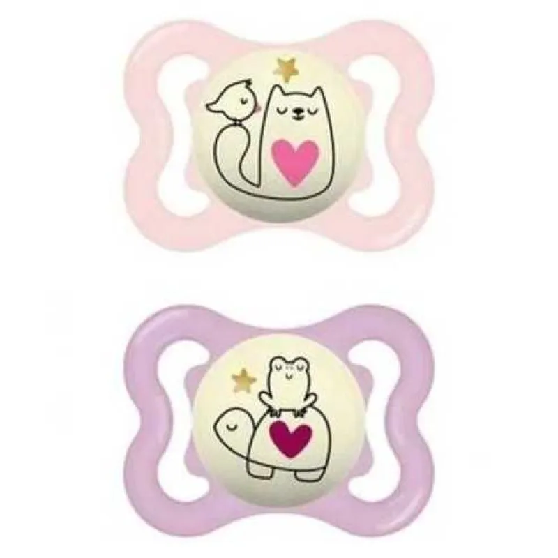 La presentación de MAM CHUPETE SILICONA SIMETRICA SUPREME NIGHT ROSA 2-6 MESES contiene 2 unidades de chupetes.
