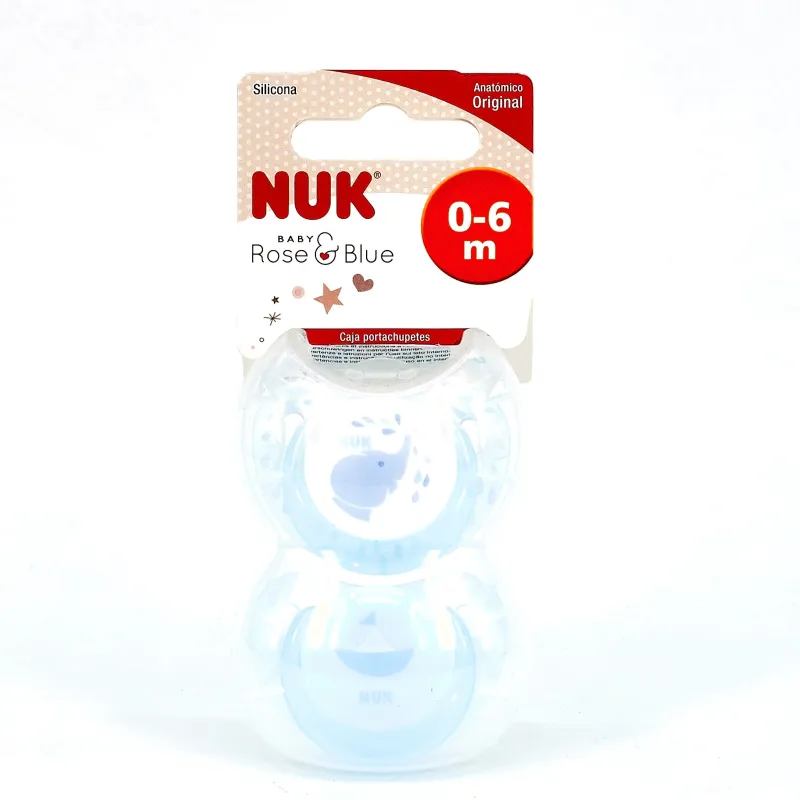 NUK Chupete Rose & Blue Silicona 0-6 m Azul es un pack que incluye dos chupetes desarrollados bajo un exclusivo diseño anatómico que contribuye a estimular la succión natural de los bebés de 0 a 6 meses.