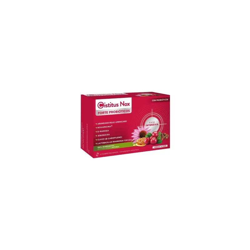 Cistitus Nox Forte es un complemento alimenticio en sobres que combina D-manosa y cepas de Lactobacillus para contribuir al equilibrio fisiológico del tracto urinario. Su formulación está concebida para complementar la dieta de personas que desean apoyar la salud urinaria y mantener las defensas naturales del sistema uro-genital.