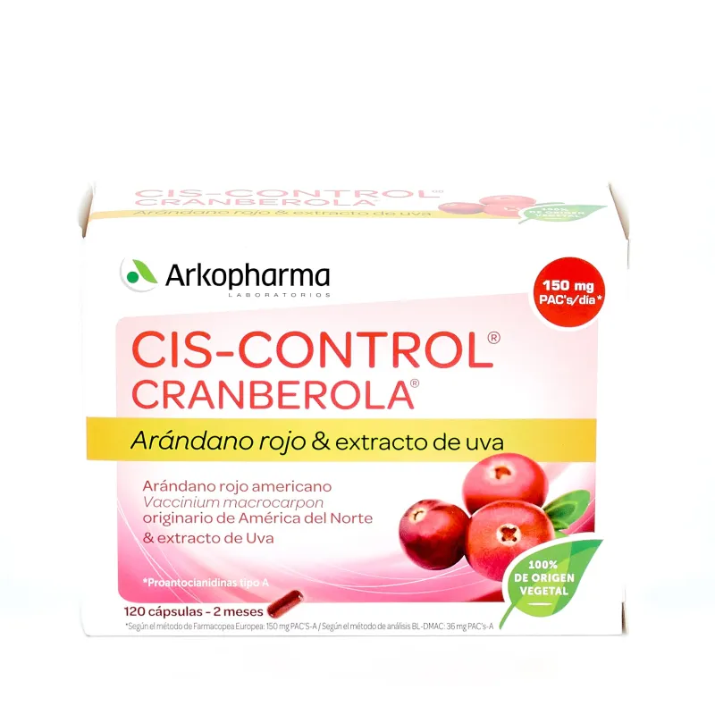 Cranberola Cis-control es un complemento alimenticio formulado por Arkopharma en cápsulas duras, que combina extracto de arándano rojo americano (Cranberry) y extracto de uva. Su objetivo es aportar 140 mg diarios de proantocianidinas, compuestos que contribuyen al bienestar de las vías urinarias y favorecen la función normal del tracto excretor.