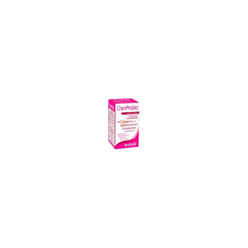 Health Aid Cranprobio es un complemento alimenticio formulado a base de arándano rojo, extracto de semilla de pomelo y bacterias ácido-lácticas que contribuyen al bienestar del sistema digestivo y urinario. Este producto se presenta en cápsulas y está pensado para aquellas personas que desean mantener de manera natural el equilibrio de la microbiota intestinal y el entorno urinario. Su formulación es apta para vegetarianos, libre de gluten y sin lactosa.