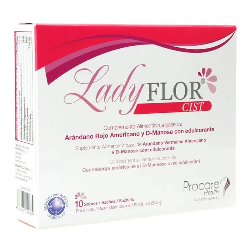 Ladyflor Cist es un complemento alimenticio en formato de sobres que combina extractos de arándano rojo, d-manosa y vitamina C. El arándano rojo (Vaccinium macrocarpon) aporta proantocianidinas de tipo A asociadas tradicionalmente al bienestar de las mucosas urinarias. La d-manosa es un monosacárido que puede contribuir a mantener un entorno favorable en las vías urinarias. La vitamina C contribuye al funcionamiento normal del sistema inmunitario.