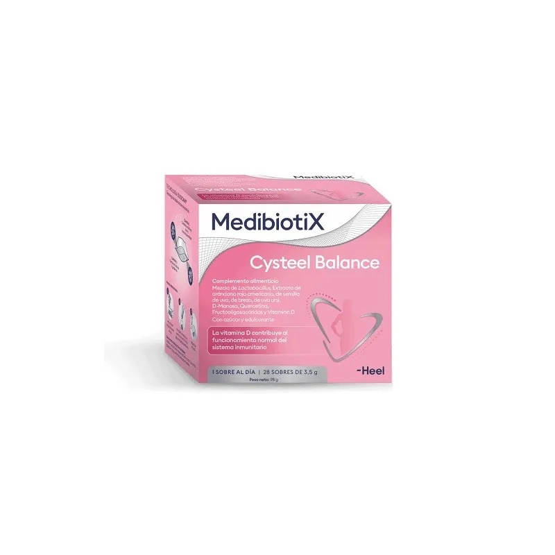 MedibiotiX cysteel balance es un complemento alimenticio en sobres monodosis, formulado para contribuir al bienestar del sistema urinario. Combina extractos de arándano rojo, D-Manosa, brezo, quercetina y semillas de uva con simbióticos (probióticos y prebióticos) y vitaminas, ofreciendo un apoyo integral que respeta la microbiota y ayuda a mantener el buen funcionamiento urinario.