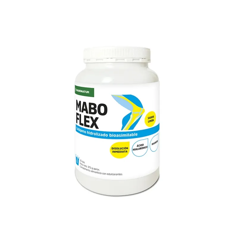 Maboflex Colágeno Limón es un complemento alimenticio en polvo diseñado para aportar colágeno hidrolizado junto con otros nutrientes como ácido hialurónico, magnesio y vitaminas del grupo B y C. Este producto proporciona ingredientes que participan en funciones fisiológicas relacionadas con el mantenimiento de los tejidos conectivos, huesos y músculos.