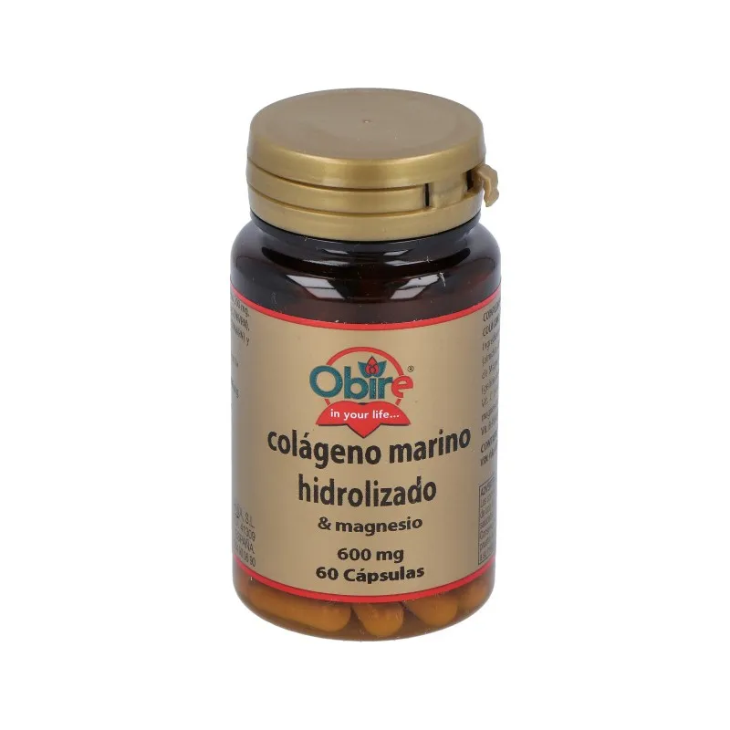 Obire Colágeno Marino Hidrolizado + Magnesio, 60 Cápsulas es un complemento alimenticio que combina colágeno marino hidrolizado y magnesio en una presentación diaria. El colágeno marino hidrolizado es una fuente de aminoácidos que forman parte de las proteínas estructurales del organismo, mientras que el magnesio es un mineral esencial para la síntesis proteica y el equilibrio electrolítico.