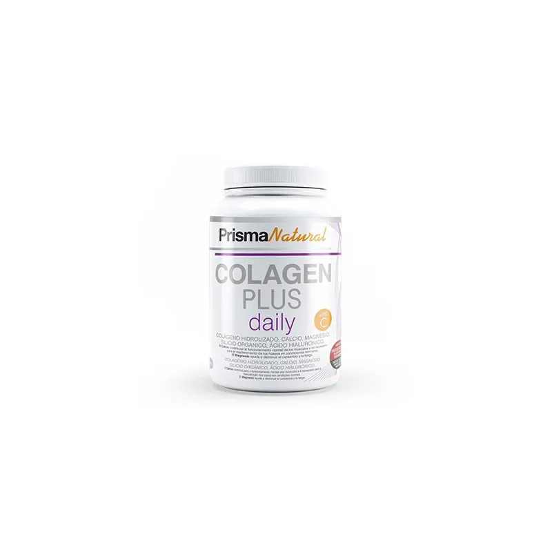 Prisma Natural Colagen Plus Daily es un complemento alimenticio en polvo que aporta colágeno marino hidrolizado junto con vitamina C, silicio orgánico, ácido hialurónico, calcio y magnesio. Está formulado para complementar la dieta y proporcionar nutrientes que contribuyen al mantenimiento de huesos, articulaciones, piel, cabello y uñas.