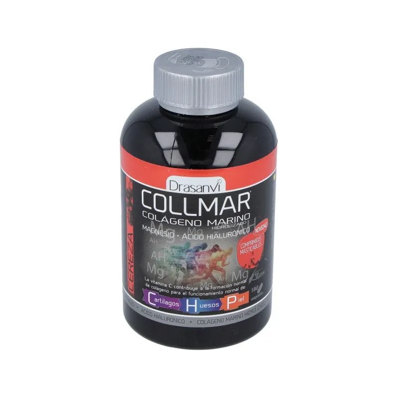 Collmar sabor cereza 180 comprimidos masticables es un complemento alimenticio que combina colágeno marino hidrolizado, vitamina C y magnesio en un formato práctico y agradable al paladar. Los ingredientes han sido seleccionados para contribuir al mantenimiento normal de los huesos, músculos y articulaciones, aportando péptidos, vitaminas y minerales esenciales para el bienestar del sistema musculoesquelético.