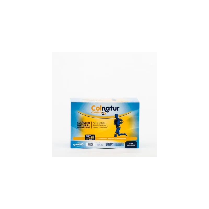 Colnatur Complex Go es un complemento alimenticio en formato sobres que combina colágeno hidrolizado de alta biodisponibilidad con magnesio, vitamina C y ácido hialurónico. El colágeno hidrolizado aporta péptidos de fácil absorción que contribuyen al mantenimiento normal del tejido conectivo. La vitamina C participa en la formación de colágeno, el magnesio colabora en el metabolismo energético y la síntesis de proteínas, y el ácido hialurónico aporta componentes de la matriz extracelular.