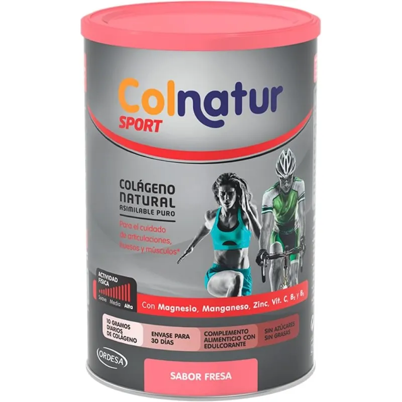 Colnatur Sport Fresa es un complemento alimenticio en polvo que contiene colágeno hidrolizado de origen natural y una combinación de vitaminas y minerales. Presenta un agradable sabor a fresa y ha sido formulado para contribuir a la nutrición de músculos, ligamentos, articulaciones y huesos dentro de la normalidad, especialmente en personas con actividad física intensa. Su fórmula libre de azúcares, conservantes, colorantes y alérgenos facilita su integración en dietas diversas y es apta para diabéticos e intolerantes al gluten.
