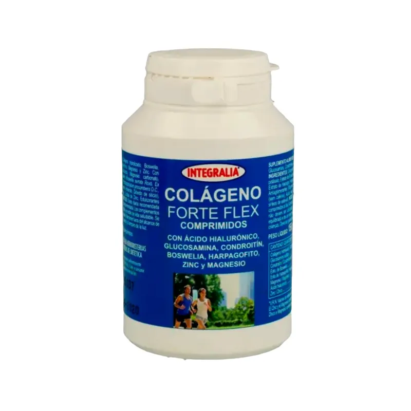 Integralia Forte Flex, 120 comprimidos es un complemento alimenticio que combina colágeno hidrolizado, glucosamina, condroitina, ácido hialurónico, boswellia, harpagofito, magnesio y zinc. Está formulado para contribuir al bienestar y movilidad de las articulaciones, así como al mantenimiento de los cartílagos y huesos en condiciones normales.