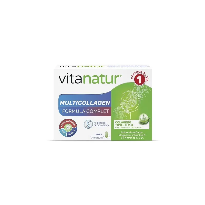 Vitanatur Multicollagen es un complemento alimenticio formulado para aportar una combinación de colágeno tipo II y colágeno de membrana de cáscara de huevo (tipos I, V y X), ácido hialurónico, vitaminas C, K2 y D3, y magnesio. Esta fórmula ha sido diseñada para contribuir al aporte diario de sus ingredientes, los cuales intervienen en distintos procesos fisiológicos relacionados con la salud del tejido conectivo, los huesos, los músculos y la piel. Se presenta en un envase de 30 cápsulas, suficiente para un mes de consumo a la dosis recomendada.