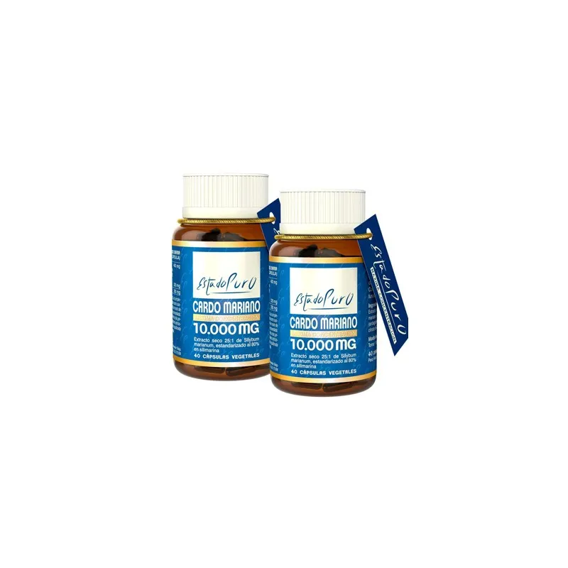 Estado Puro Cardo Mariano, 40 cápsulas es un complemento alimenticio formulado con extracto seco de semillas de Silybum marianum, estandarizado en silimarina. La silimarina es un complejo de flavonolignanos que contribuye a la protección de las células frente al daño oxidativo y apoya las funciones metabólicas del hígado. Este formato en cápsulas vegetal facilita la ingesta y garantiza una dosificación precisa de silimarina.
