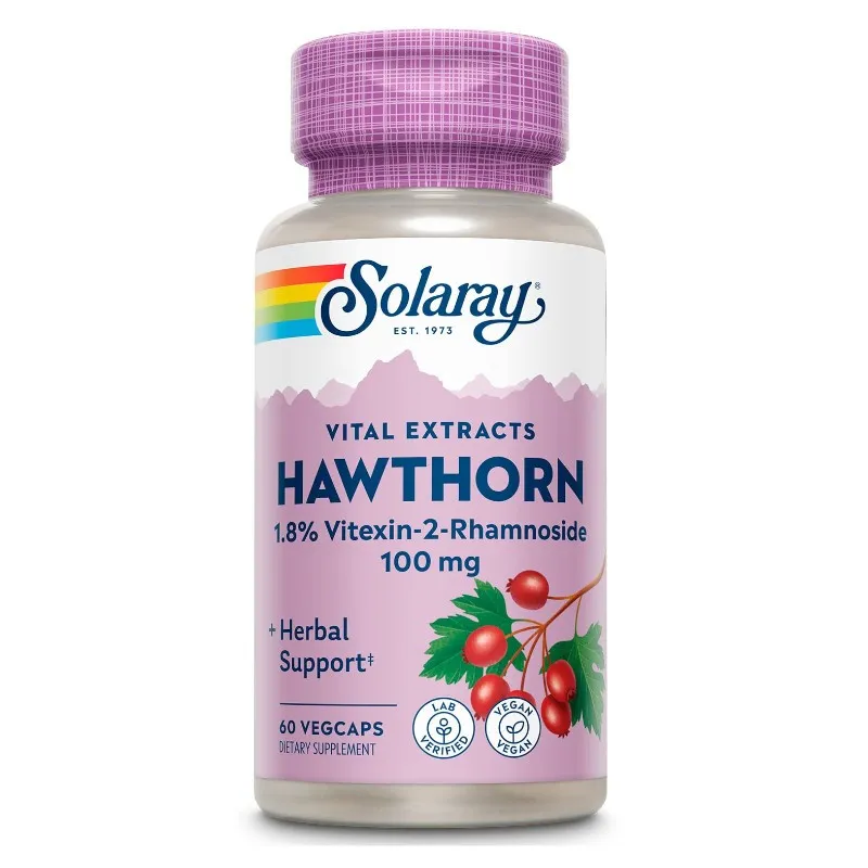 Solaray Hawthorn Extract 100mg - 60 vegcaps es un complemento alimenticio basado en extracto seco de espino blanco (Crataegus monogyna) en cápsulas vegetales. Cada vegcaps contiene 100 mg de extracto de espino blanco estandarizado en flavonoides. Se presenta en frasco con 60 cápsulas aptas para dietas vegetarianas y veganas.