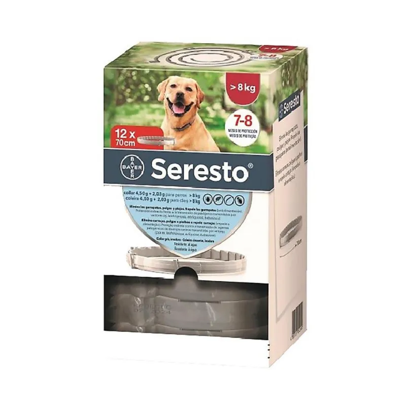 Este producto se presenta en un paquete que contiene un collar de Seresto para perros que pesen más de 8 kg.