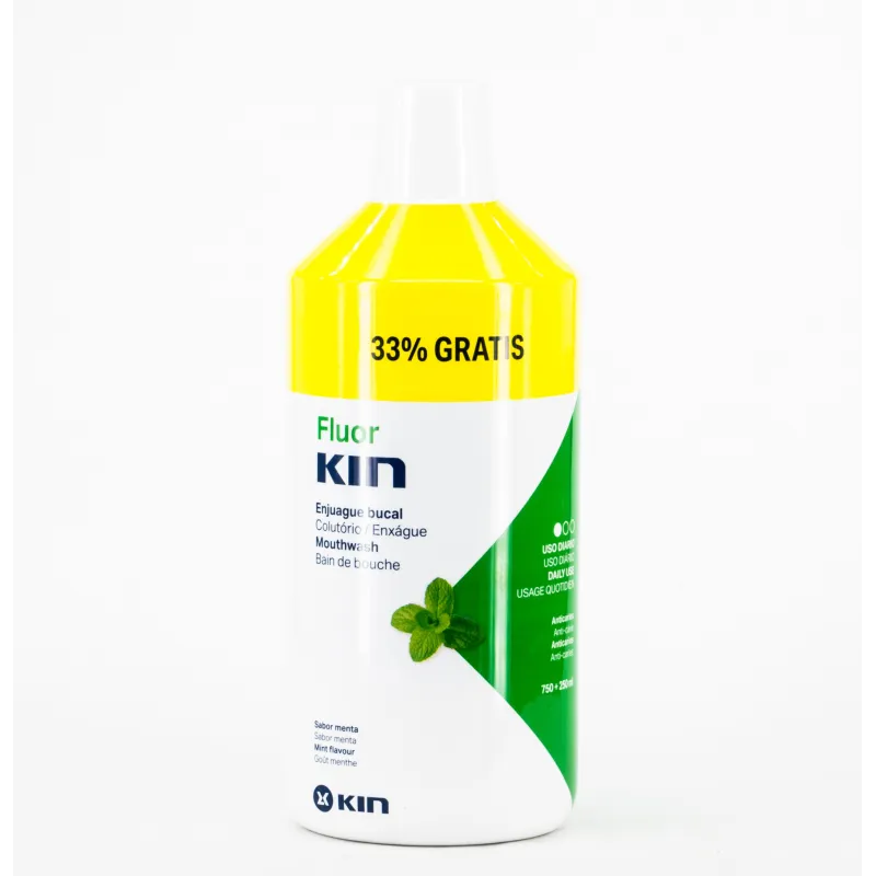 Flúor Kin Anticaries Diario viene en frasco de 750 ml + 250 ml gratis.