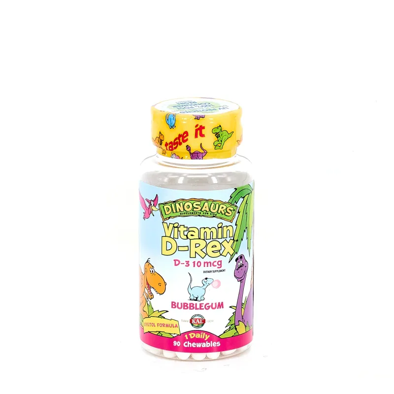 Envase con 90 tabletas masticables con forma de dinosaurio y sabor a chicle, en dosis de 400 UI de vitamina D3 por tableta. Se incluye información de lote y caducidad en el envase exterior.