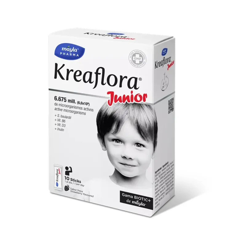 Mayla Kreaflora Junior Sabor Fresa es un complemento alimenticio en formato sticks diseñado para aportar probióticos, prebióticos y micronutrientes que están implicados en funciones fisiológicas normales relacionadas con el equilibrio de la flora intestinal y la digestión cuando se toma como parte de una dieta equilibrada. Su fórmula combina varias cepas de microorganismos vivos y fibra prebiótica junto con vitaminas que apoyan funciones del sistema inmunitario en niños.