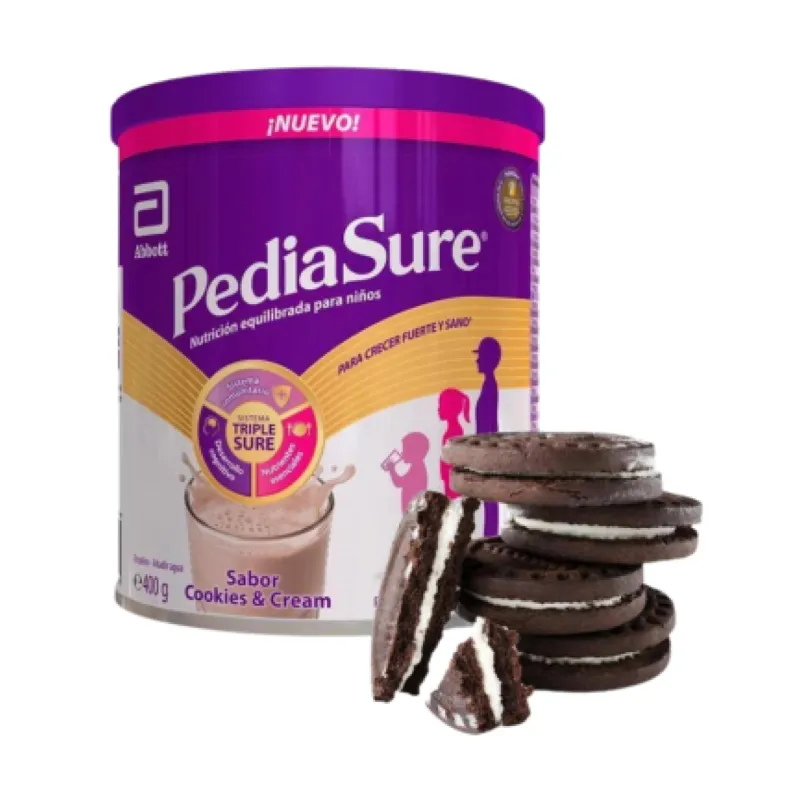 Pediasure Cookies&Cream, 400 gr es un complemento alimenticio en polvo formulado con proteínas de suero lácteo, carbohidratos de origen vegetal, grasas insaturadas, vitaminas (A, C, D y del grupo B) y minerales (calcio, magnesio y zinc). Gracias a su formato en polvo, ofrece una aportación controlada de nutrientes que ayuda a completar la ingesta diaria recomendada en la población infantil. Está indicado en niños con dietas selectivas, bajo apetito o períodos de crecimiento acelerado, permitiendo complementar la alimentación habitual. La fórmula sin azúcares añadidos se mezcla fácilmente con agua o leche, ofreciendo un sabor a galletas y crema que facilita su aceptación.