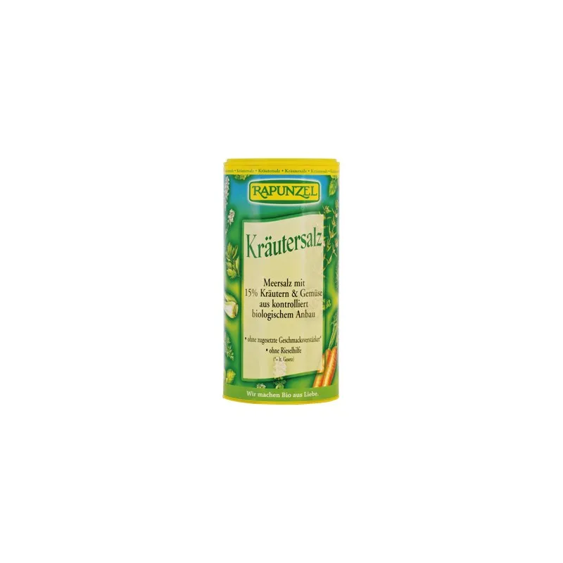 Sal Hierbas Rapunzel 125g es una mezcla culinaria de sal marina fina y hierbas biológicas molidas. Se utiliza para sazonar y realzar el sabor de verduras, carnes, pescados, sopas y ensaladas, integrando un toque aromático y natural en los platos.