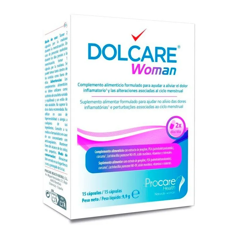 Dolcare Woman es un complemento alimenticio en cápsulas formulado para el bienestar de la mujer durante el ciclo menstrual. Contiene una combinación de ingredientes de origen vegetal y micronutrientes seleccionados por su contribución al equilibrio hormonal y al confort general. Este complemento apoya la ingesta de nutrientes que pueden resultar útiles durante los días previos y durante la menstruación, contribuyendo al confort y equilibrio fisiológico en dichas fases.