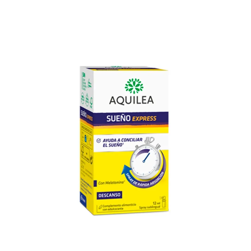 Aquilea Sueño Express Spray Sublingual es un complemento alimenticio formulado con melatonina, presentado en envase de 12 ml con sabor a limón. Su diseño sublingual favorece la absorción rápida de la hormona, cuyo objetivo es ayudar a iniciar el ciclo del sueño de forma más ágil.