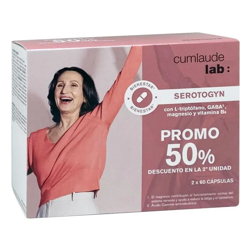 Cumlaude Serotogyn Duplo es un complemento alimenticio diseñado para mujeres en la etapa de la menopausia. Combina L-triptófano, GABA, magnesio y vitamina B6, sus ingredientes contribuyen a la síntesis y al correcto equilibrio de neurotransmisores relacionados con el estado de ánimo y la reducción del cansancio. Se presenta en dos envases de 60 cápsulas, libres de gluten y lactosa, cubriendo un tratamiento continuado de dos meses.