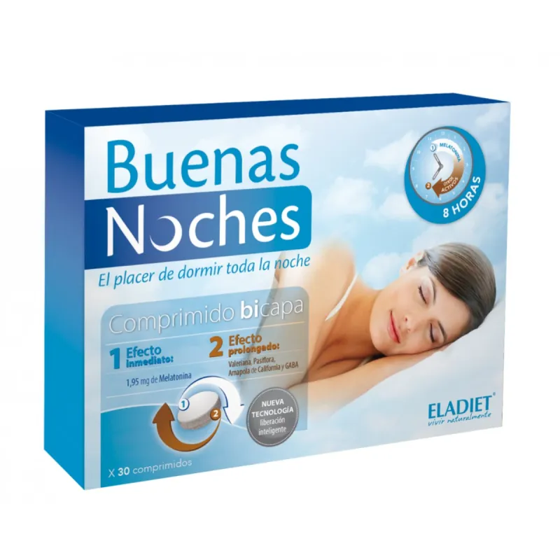 Eladiet Buenas Noches es un complemento alimenticio formulado con ingredientes de origen natural que contribuyen al equilibrio del ritmo circadiano y favorecen la relajación. Está diseñado para complementar una dieta equilibrada y un estilo de vida saludable, integrando plantas medicinales y micronutrientes que intervienen en los procesos fisiológicos del descanso y el bienestar nocturno.