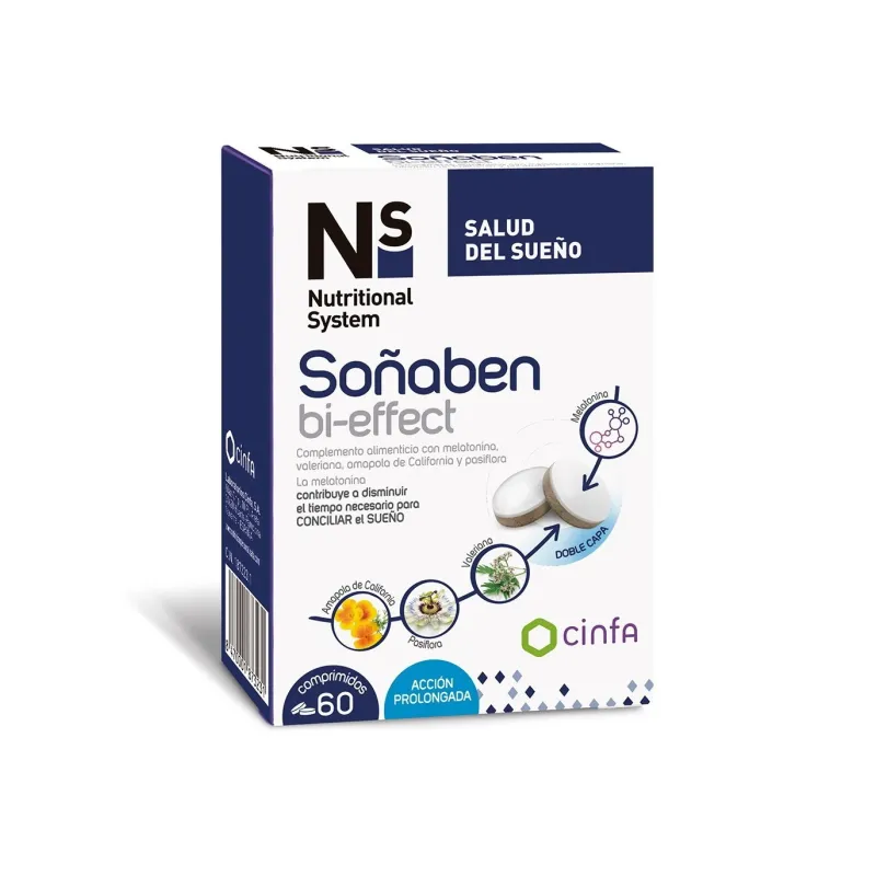 NS Soñaben Bi-Effect es un complemento alimenticio en comprimidos bicapa que aporta melatonina y extractos secos de pasiflora, valeriana y amapola de California. La formulación bicapa permite una liberación controlada: la primera capa libera melatonina para contribuir a la reducción del tiempo necesario para conciliar el sueño, mientras la segunda capa libera gradualmente los extractos vegetales para favorecer el mantenimiento de ciclos de sueño de calidad. Su presentación en envase con 60 comprimidos ofrece una dosificación diaria y prolongada para apoyar el descanso nocturno.