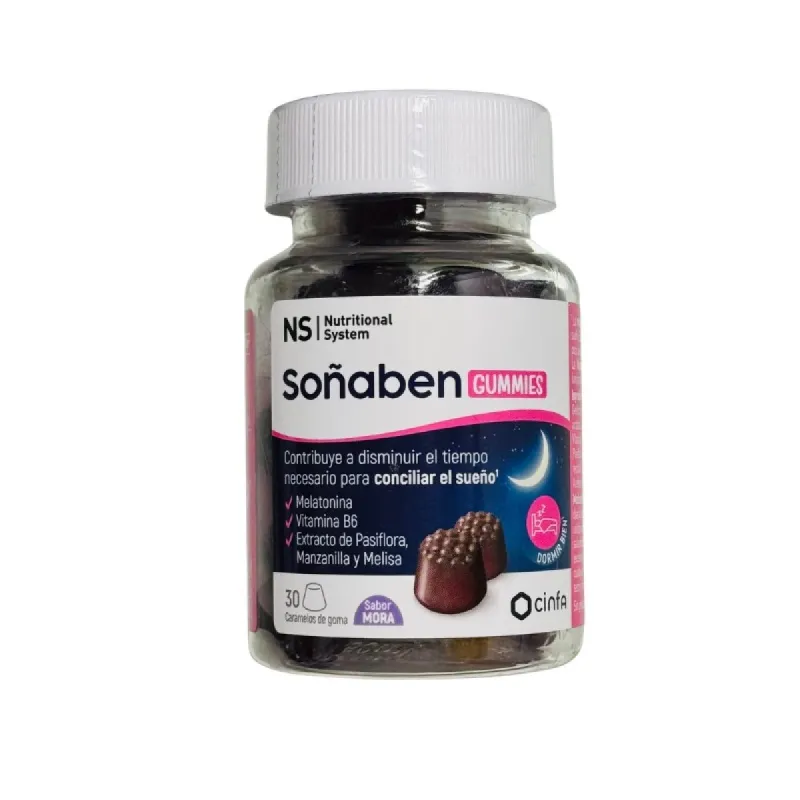 NS Soñaben Gummies Sabor Mora es un complemento alimenticio en formato de caramelo de goma, formulado con melatonina y vitamina B6 para contribuir al bienestar nocturno. Las gominolas aportan una forma práctica y agradable de incluir ingredientes que, según el Reglamento (CE) 1924/2006 y la AESAN, pueden ayudar a reducir el tiempo necesario para conciliar el sueño y a mantener el sistema nervioso en condiciones normales.