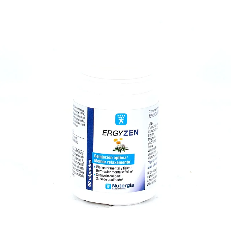 Nutergia Ergyzen es un complemento nutricional que combina extractos botánicos, aminoácidos y micronutrientes para contribuir al equilibrio físico y mental dentro de un estilo de vida saludable. Está formulado con ácido gamma-aminobutírico (GABA), magnesio, valeriana, amapola de California, vitaminas del grupo B, cobre y zinc.