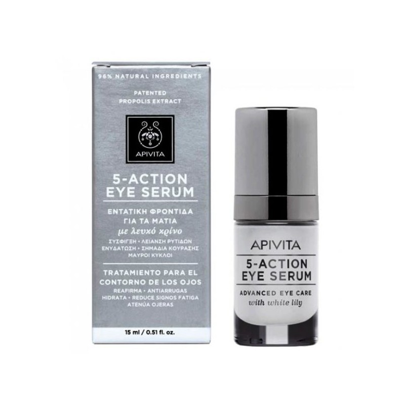 El nuevo Serum para el contorno de ojos 5-Action de Apivita reduce las ojeras, atenúa los signos de fatiga, combate las arrugas y aporta hidratación y un potente efecto reafirmante a la delicada piel de esta zona.