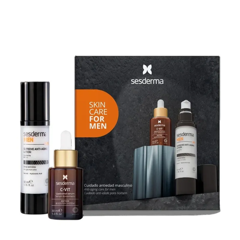 Este pack combina dos productos clave de la línea Sesderma Men: la Loción Antiedad Supreme (50 ml) y el Sérum Liposomado C Vit (30 ml). Diseñado específicamente para piel masculina, ofrece un cuidado antiedad completo que hidrata, protege y mejora el aspecto del rostro con una rutina sencilla y eficaz.
