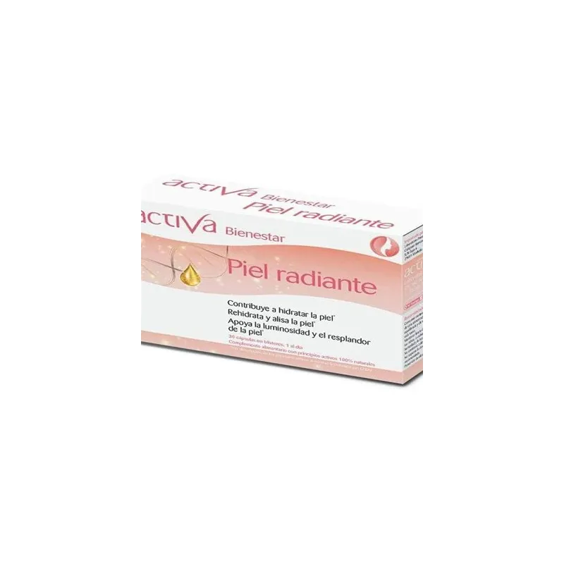 Activa Bienestar Piel Radiante es un complemento alimenticio en cápsulas con biotina, vitaminas C y E, colágeno hidrolizado, zinc y selenio, que contribuyen al mantenimiento normal de la piel.