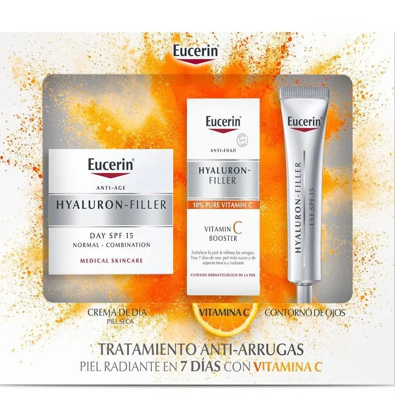 Nuevo Pack Ahorro Eucerin Hyaluron-filler Piel Mixta Tratamiento Anti-Arrugas Piel Radiante en 7 días con Vitamina C, incluye crema de día para piel seca, Booster Vitamina C y Contorno de ojos.