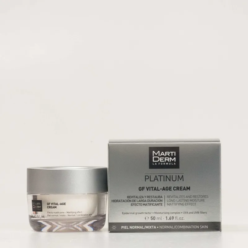 Martiderm Platinum GF Vital-Age Cream Pieles Normales/Mixtas se presenta en un envase tipo tarro que contiene 50 ml.