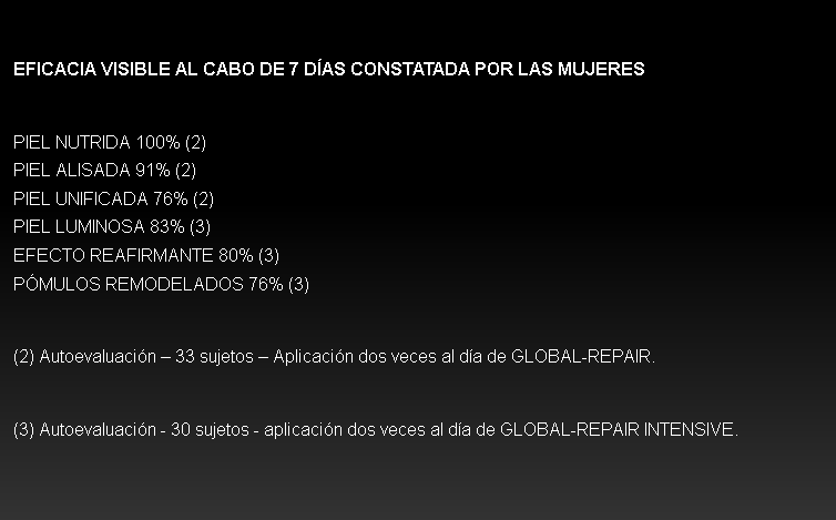 De forma global se logra atacar los distintos signos del envejecimiento en la piel luchando contra arrugas, deshidratación, pérdida de luminosidad, flacidez, manchas, tez opaca o falta de volumen.