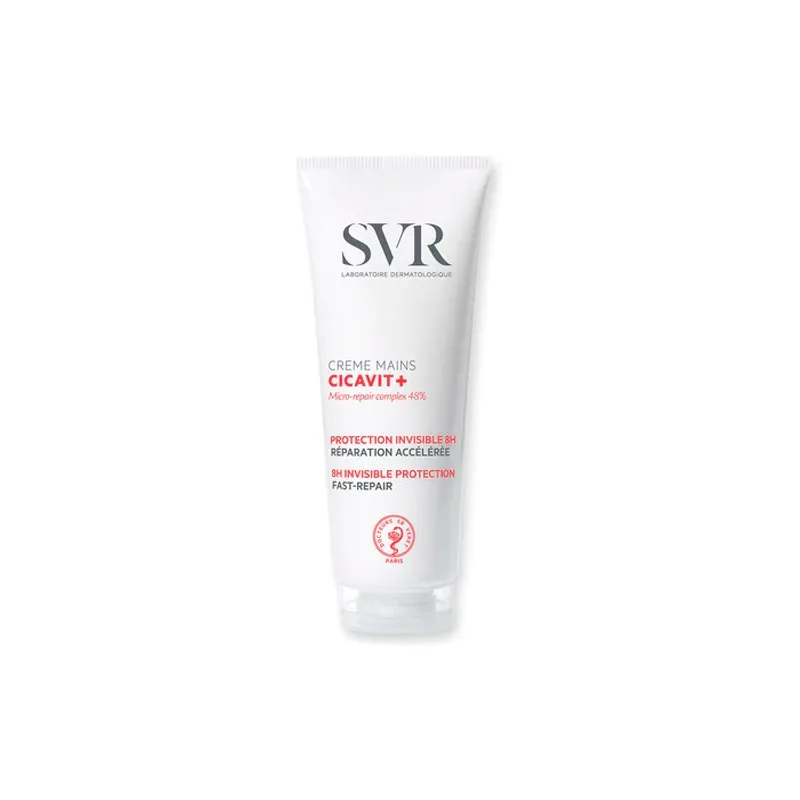 SVR Creme Mains Cicavit +es una crema de manos concebida para la recuperación de las manos dañadas y sobreexpuestas a las agresiones externas. Presenta una textura resistente de rápida absorción que permite retomar las actividades en poco tiempo.
