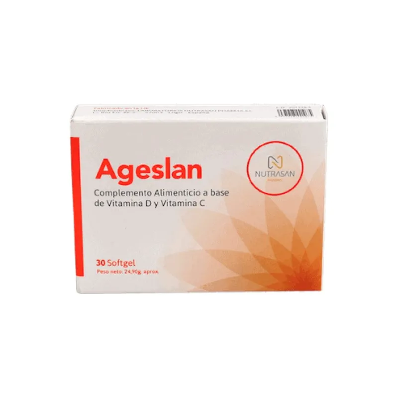 Ageslan 30 perlas Softgel es un complemento alimenticio que presenta vitamina D3 y vitamina C en formato de cápsulas blandas. Cada perla aporta 2000 UI de colecalciferol y 80 mg de ácido ascórbico. Los nutrientes presentes contribuyen al mantenimiento de los huesos en condiciones normales y al funcionamiento normal de los músculos, así como a la formación normal de colágeno para el mantenimiento de huesos y cartílagos saludables.