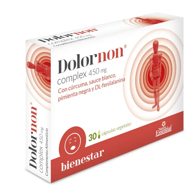 Dolornon® 450 mg de Nature Essential es un complemento alimenticio que combina extractos de plantas y aminoácidos, diseñado para apoyar el bienestar de las articulaciones y músculos. Su fórmula incluye cúrcuma, DL-fenilalanina, sauce blanco y pimienta negra, ingredientes que contribuyen al confort articular y muscular.
