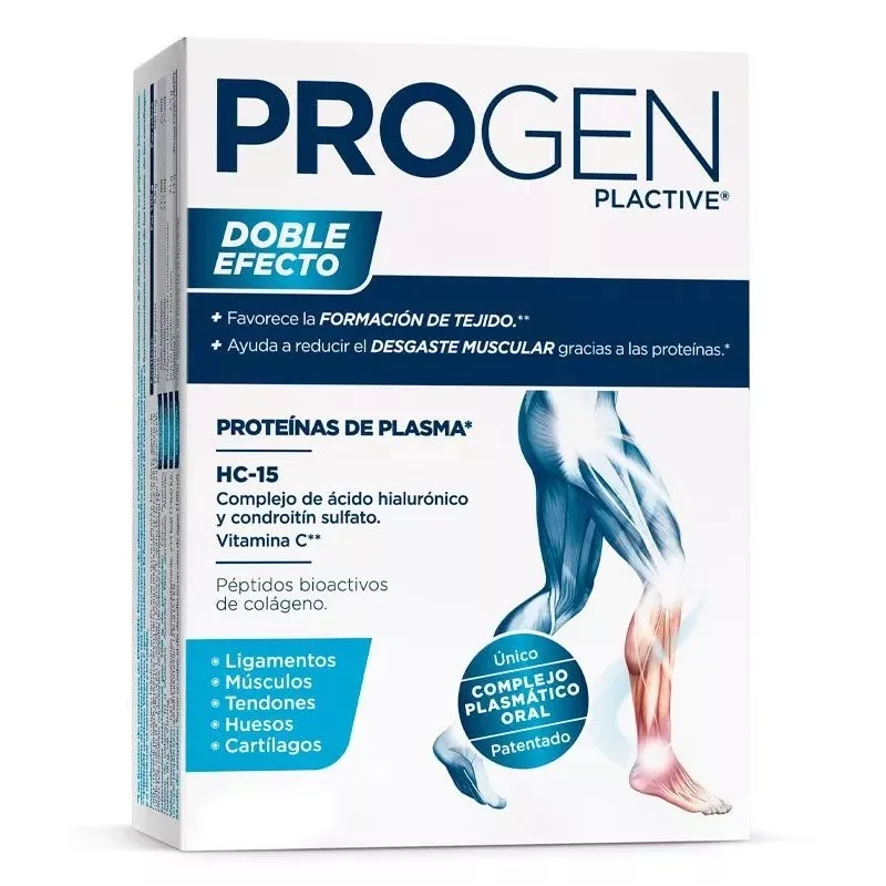 PROGen Plactive es un complemento alimenticio desarrollado para proporcionar a la dieta una combinación específica de plactive (proteínas de plasma), vitamina C, ácido hialurónico, péptidos de colágeno, condroitín y bioactivos. Esta formulación está orientada a contribuir al aporte de nutrientes implicados en el mantenimiento de la estructura y función de articulaciones, cartílagos, tendones y tejidos conectivos. Se recomienda su uso como parte de un estilo de vida activo y una dieta equilibrada, destinada a aquellos que requieren un apoyo adicional en periodos de desgaste articular o esfuerzo físico.