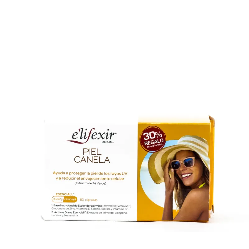 Elifexir Esenciall Piel Canela es un complemento alimenticio diseñado para aportar a la dieta diaria una combinación de ingredientes con funciones nutritivas que contribuyen al equilibrio dérmico. Sus formuladores han seleccionado compuestos que, una vez incorporados en la rutina nutricional, aportan moléculas con acción antioxidante y favorecen un bronceado más uniforme.