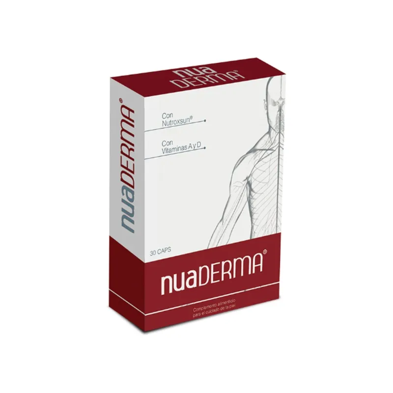nuaDERMA es un complemento alimenticio formulado con Nutroxsun®, vitaminas y oligoelementos que contribuyen a la protección y nutrición de la piel desde el interior.