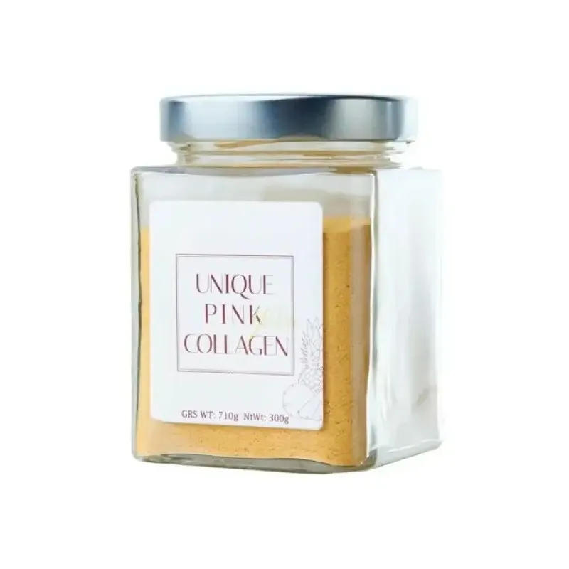 Unique Yellow Pink Collagen se presenta en un envase de 300 gramos de polvo, lo cual es suficiente para un mes de uso si se sigue la dosis recomendada.