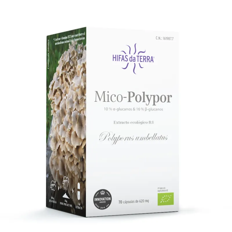 Hifas da Terra Mico-Polypor es un complemento alimenticio desarrollado a base de extracto puro de Polyporus Umbellatus obtenido de cultivo ecológico. Está formulado en cápsulas vegetales de fácil deglución y puede colaborar con los procesos de depuración natural del organismo. Además, sus componentes pueden complementar la función del sistema respiratorio.