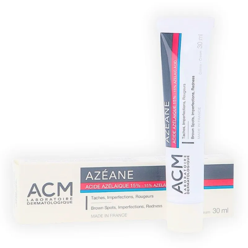 Azéane Crema con Ácido Azelaico al 15%, presentada en un envase de 30 ml, es una solución dermocosmética diseñada para mejorar la apariencia de la piel afectada por condiciones como el enrojecimiento leve y la hiperpigmentación. Esta crema se distingue por su concentración de ácido azelaico, un componente conocido por sus propiedades antioxidantes y calmantes.